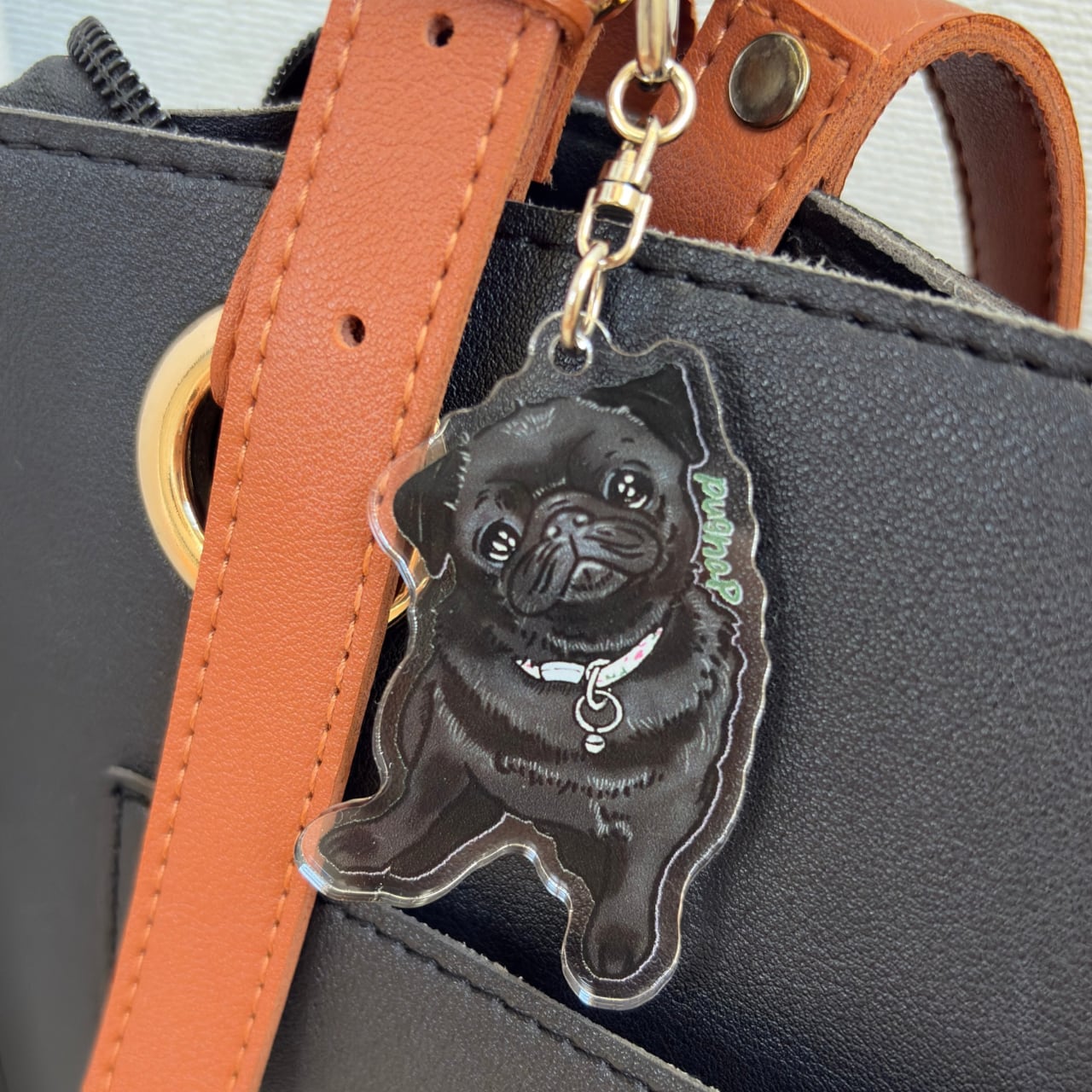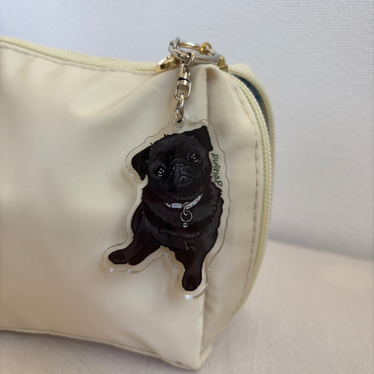 うるっとしたつぶらな瞳でこちらを見つめる黒パグのアクリルキーホルダー。