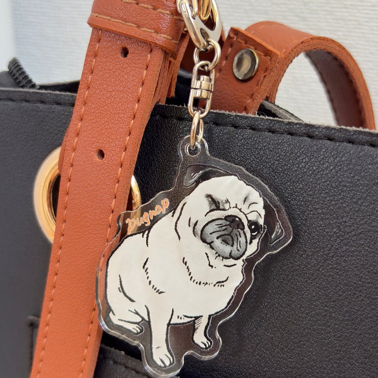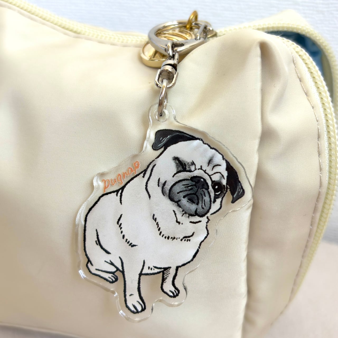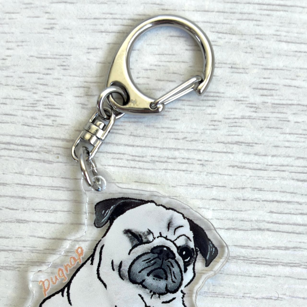 ウィンクするパグがデザインのアクリルキーホルダー。
