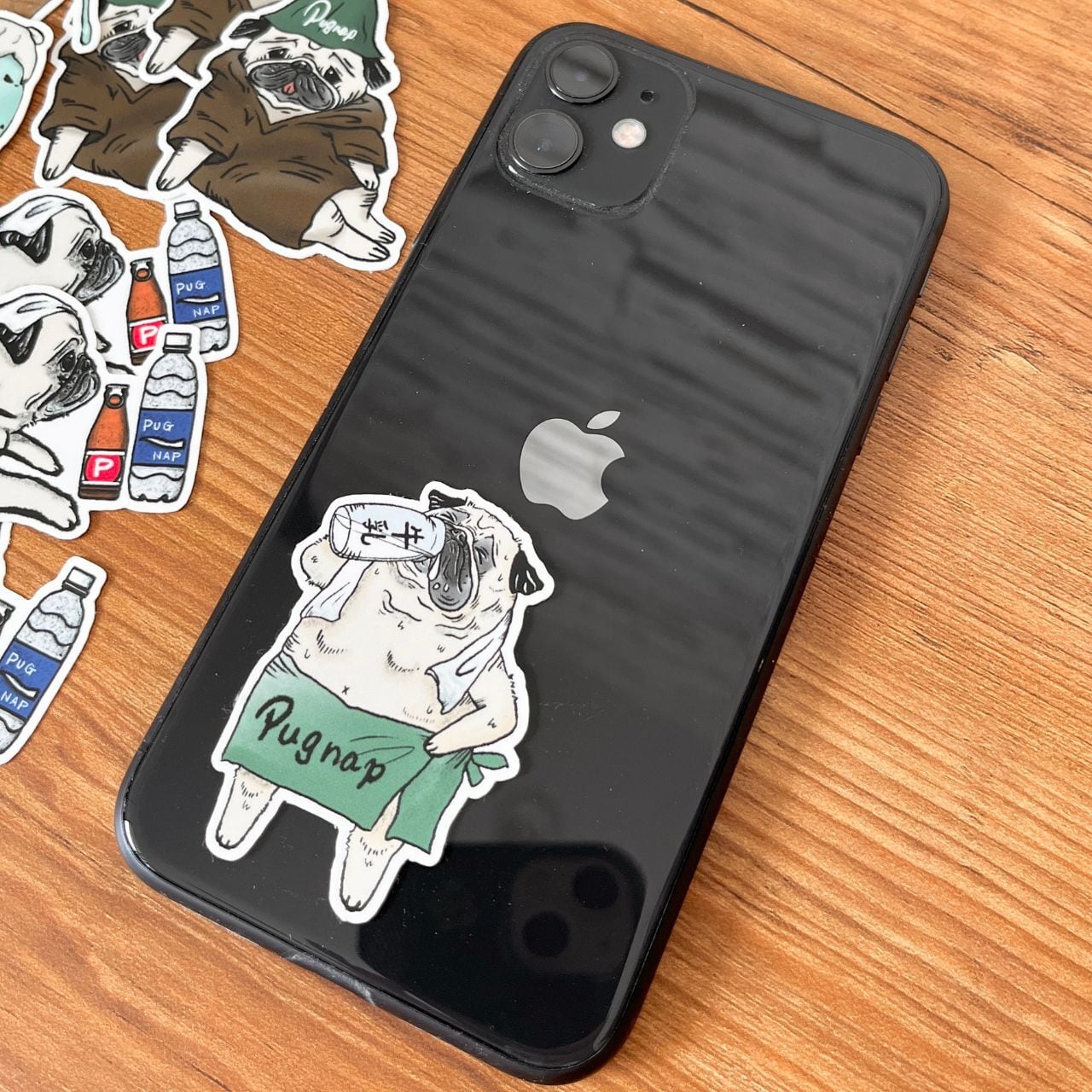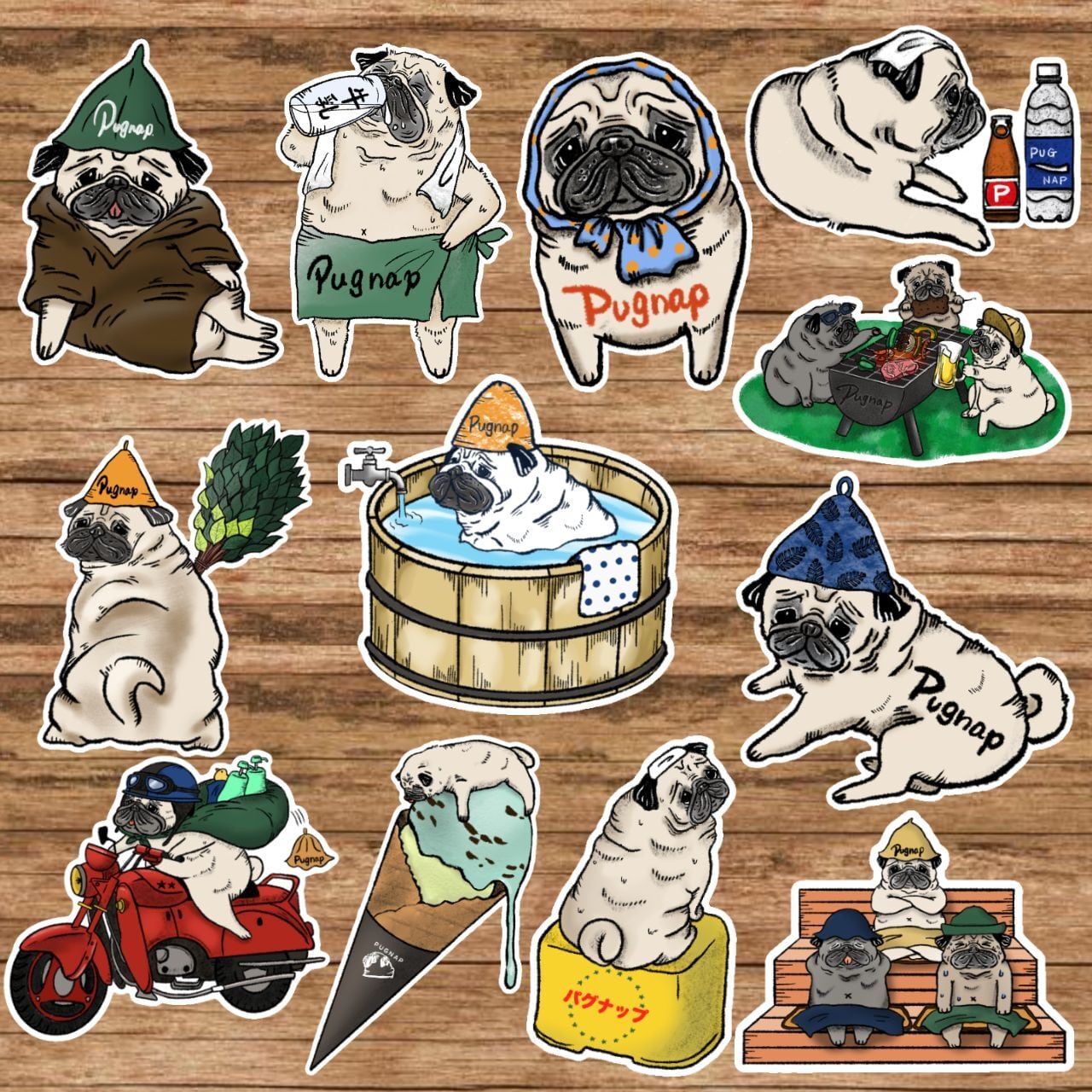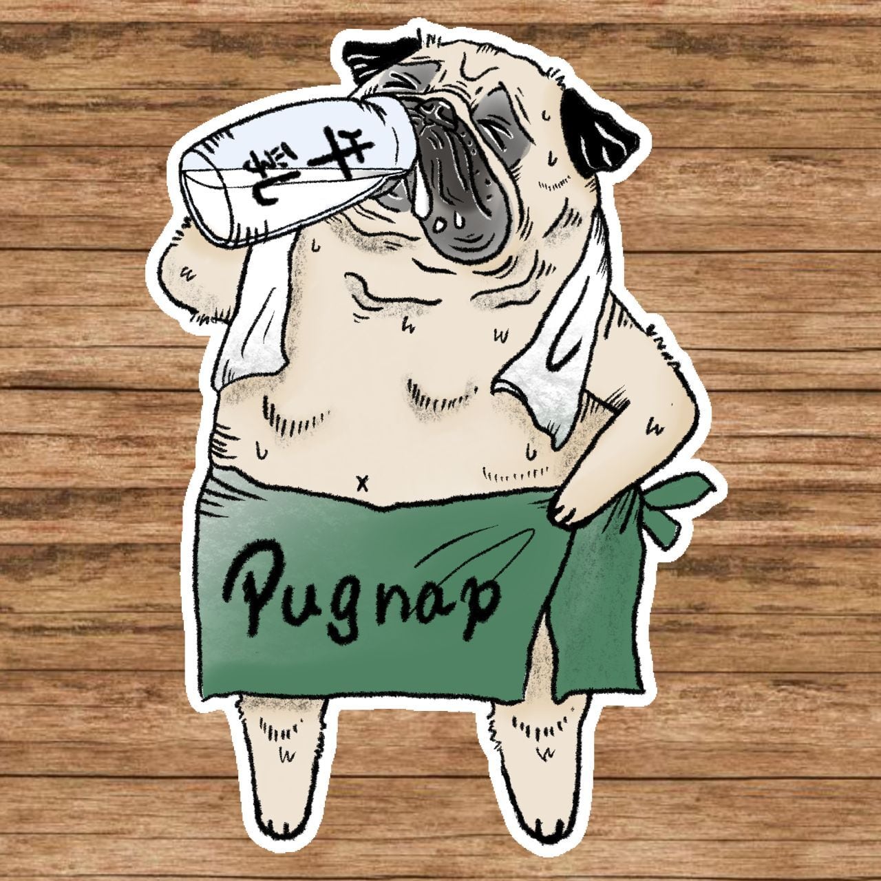 湯上がりに牛乳を一気飲みするパグがデザイン。
